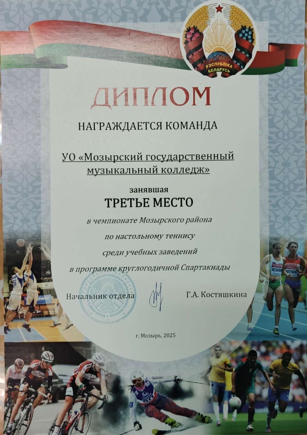 Поздравляем команду учреждения образования «Мозырский государственный музыкальный колледж», занявшую 3 место в открытом чемпионате Мозырского района по настольному теннису среди учебных заведений в программе круглогодичной Спартакиады.