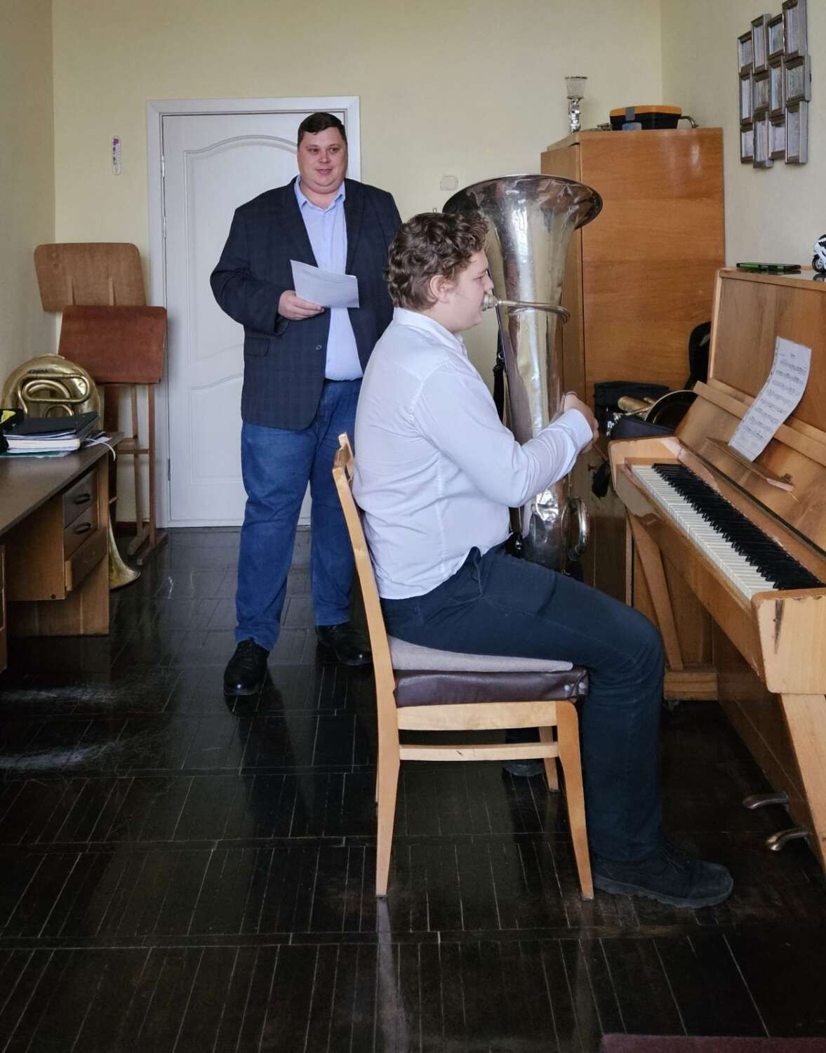 Работу над исполнительским дыханием и атакой звука продемонстрировал Д.С.Жук (класс баритона). В ходе занятия с учащимся 1 курса педагог продемонстрировал способы работы над этими ключевыми элементами.